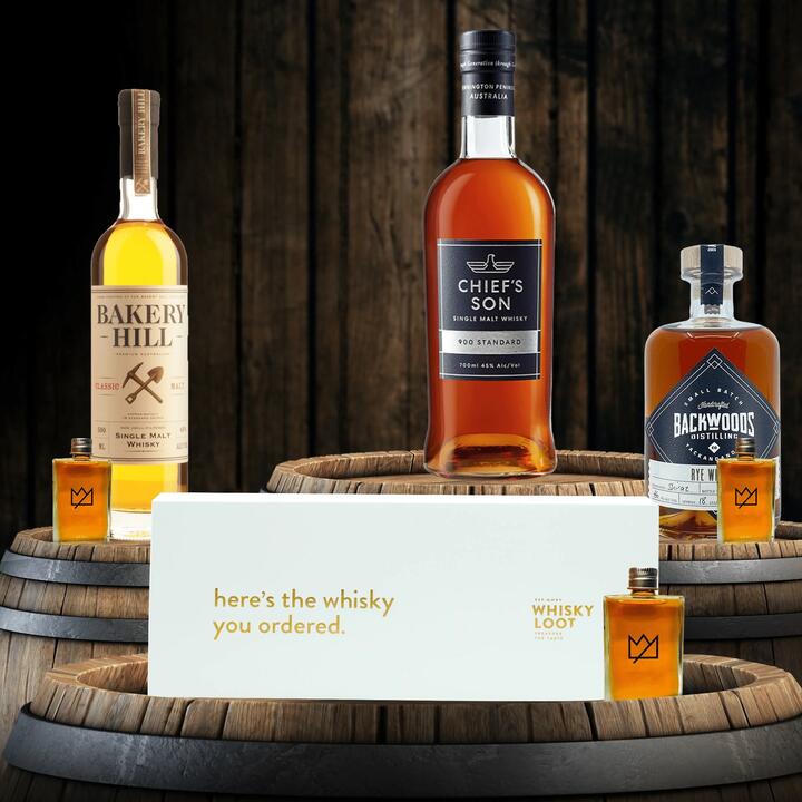 This box contains three delicious whiskies from the heart of Victoria, Australia: Bakery Hill Classic Malt Single Malt Australian Whisky, Backwoods Australian Rye Whisky – Batch #3, and Chief’s Son 900 Standard Single Malt Australian Whisky.