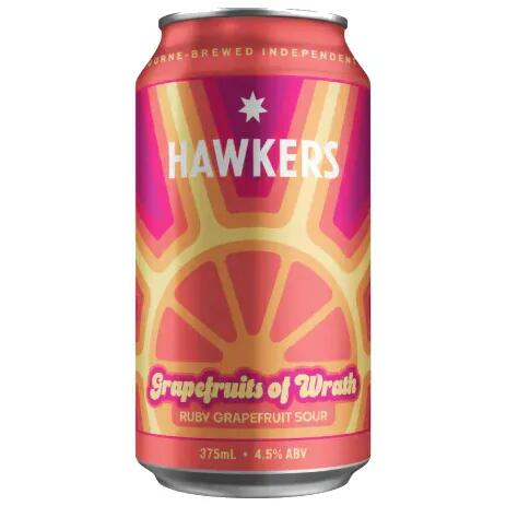 Country AustraliaBrewery HawkersStyle Fruited SourFormat 375ml CanABV 4.5Crack a refreshing tinny of full-tilt quenchedness! Sour, tart, and laden with punchy citrus vibes, the only thing Grapefruits of Wrath is out to punish is your thirst for a cold, summer-appropriate beverage. Ruby red grapefruit leads the charge, while a cavalry of lemon and pear form flank from the sides for a three-way charge on your tastebuds.Taste the wrath.
